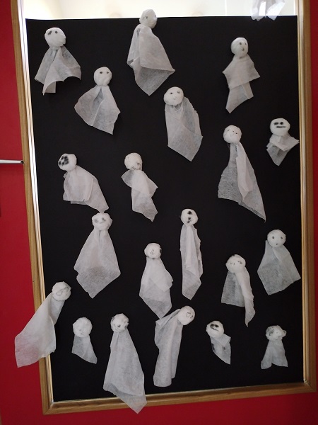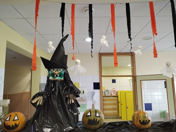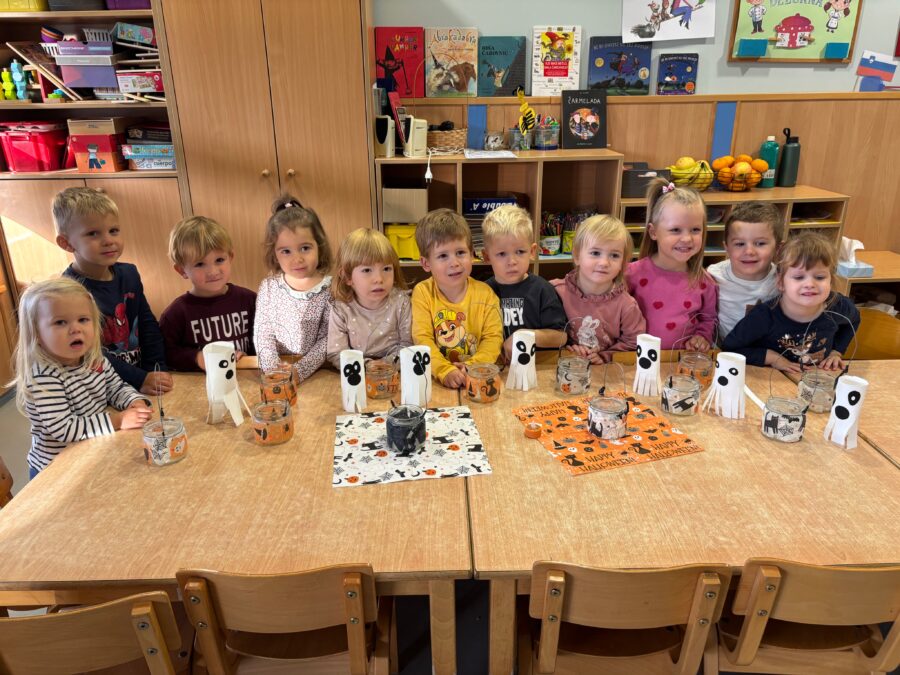 V tednu pred jesenskimi počitnicami smo si pričarali prav posebno, čarobno vzdušje. Igralnice in hodnik smo okrasili z izrezanimi bučami, duhci, pajki, čarovniškimi klobuki in gradovi.