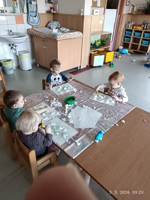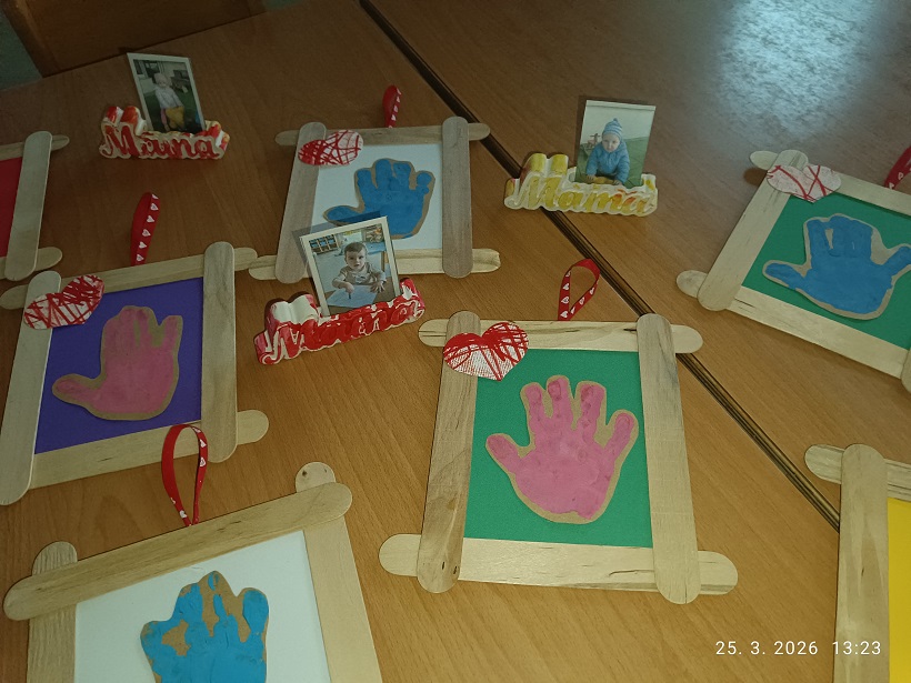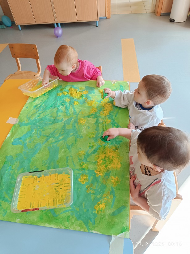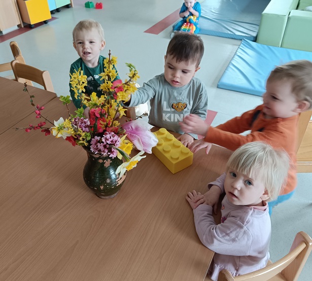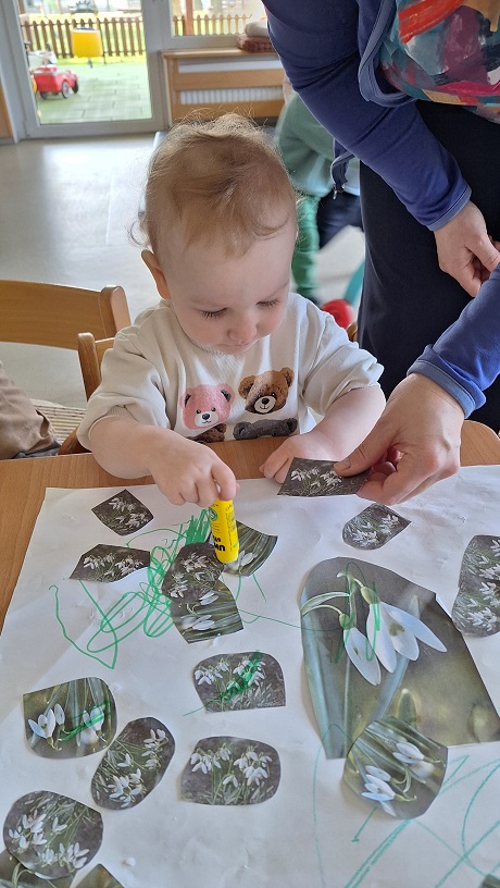 Pri likovnem ustvarjanju smo spoznavali različne likovne tehnike, materiale in pripomočke. Z dotikanjem, tipanjem, gnetenjem in ustvarjanjem smo materiale raziskovali z vsemi čutili, ob tem pa urili gibljivost prstkov ter razvijali koordinacijo oko–roka. Skupaj smo ustvarjali prve znanilce pomladi, se učili pomladnih pesmic in si z barvitimi rožami pričarali prijeten, pomladno obarvan kotiček v igralnici.