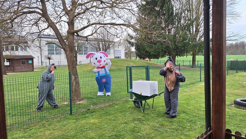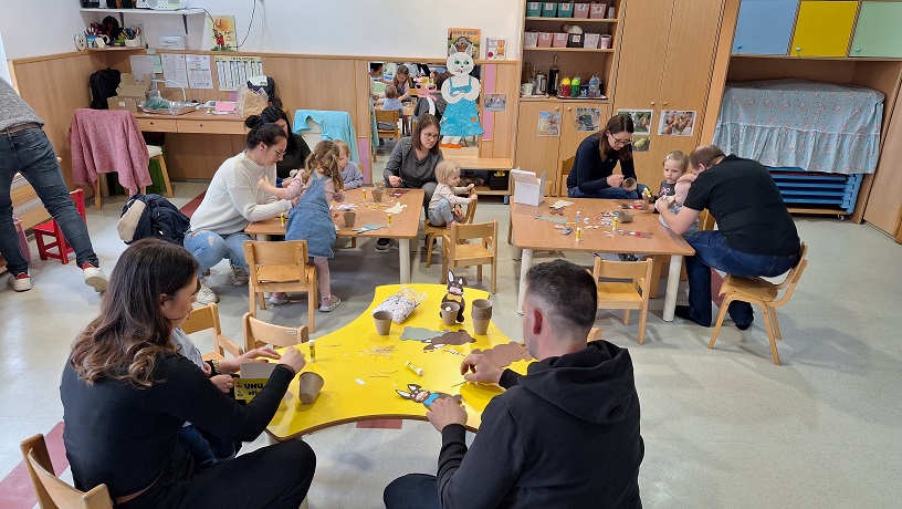 Nepozaben trenutek je bila ustvarjalna delavnica, kjer so skupaj z mamicami in atiji nastajali čudoviti izdelki, polni topline, sodelovanja in skupnih doživetij. Velikonočno vzdušje je doseglo vrhunec ob sprehodu po vrtcu z lastnoročno izdelanimi košaricami, ko so otroci, skupaj s starši, z navdušenjem iskali čokoladna jajčka, ki jim jih je skril velikonočni zajček. Posebno presenečenje pa je bilo tudi opazovanje velikih zajčkov na igrišču našega vrtca – tiho so se sprehodili iz bližnjega gozda mimo igralnic ter s svojim skrivnostnim obiskom razveselili otroke.