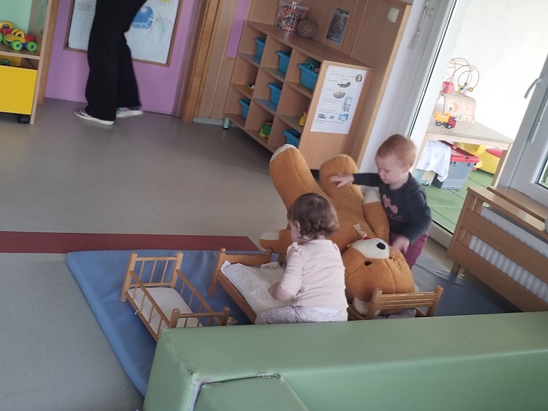 Preko slikanic smo spoznavali tudi živalske družine (Zlatolaska in trije medvedi) ter jih primerjali z našimi družinami, s čimer smo spodbujali razumevanje odnosov, pripadnosti in čustvene povezanosti. Otroci so se vživeli v vloge medvedkov in se igrali simbolne igre. Posebno veselje so otrokom prinesli zajčki – o njih smo se pogovarjali, jih opazovali v zgodbah in jih upodabljali v likovnih izdelkih. Ob pesmi in rajalni igri smo se spremenili v »gibalne, poskočne zajčke«.