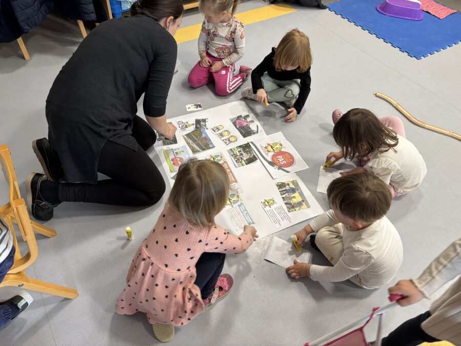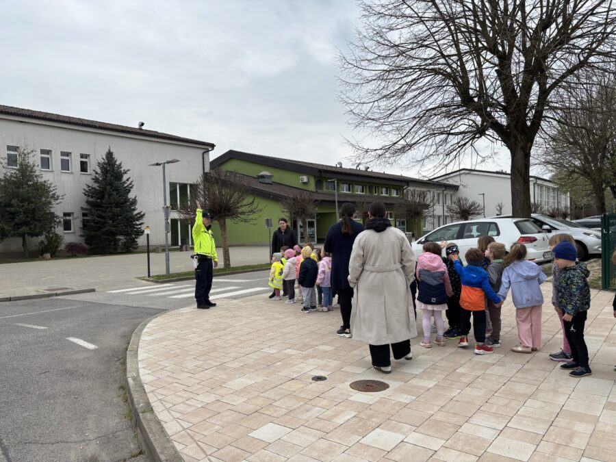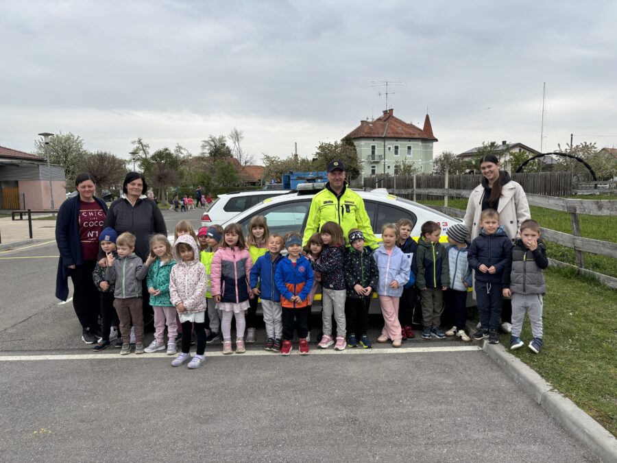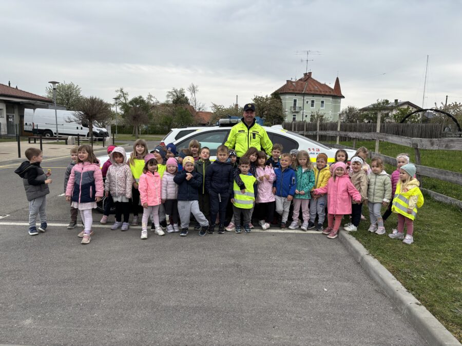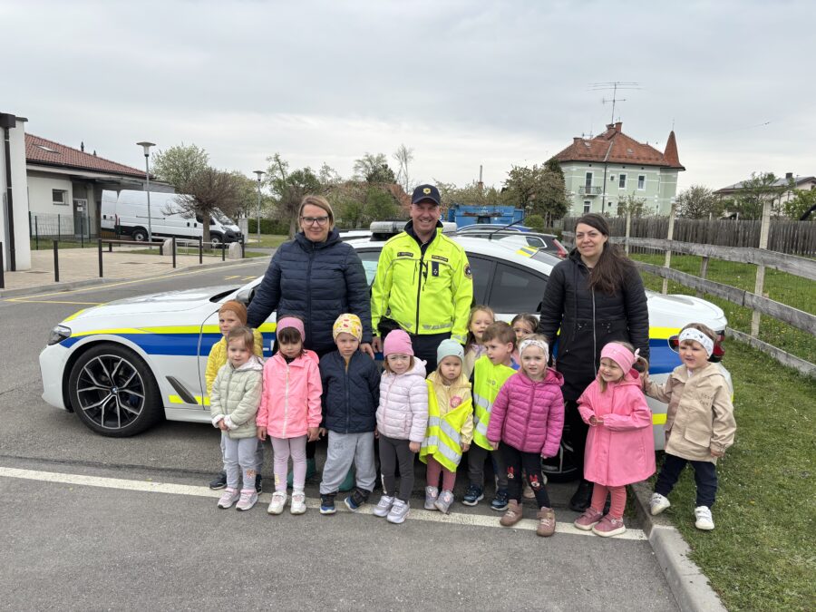 Z otroki smo izvedli tudi krajši pohod kjer smo se naučili, pravilnega prečkanja cestišča s semaforjem ter si ogledali policijsko vozilo in opremo. Otroci so aktivno sodelovali, postavljali vprašanja ter poglabljali svoje znanje o prometni varnosti.