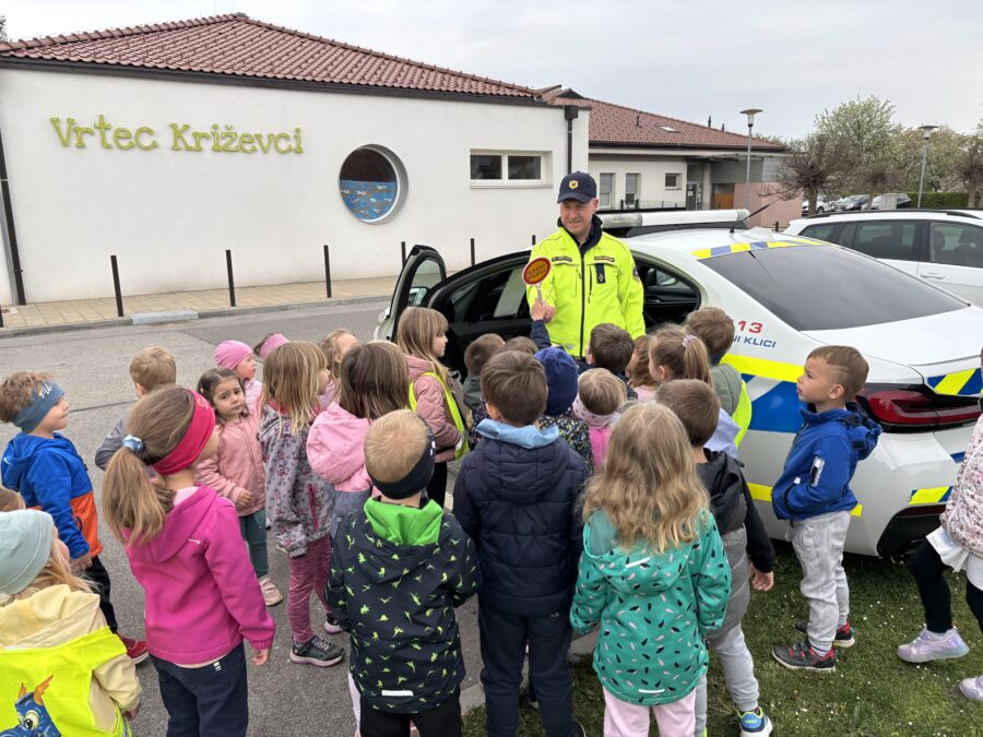 Dne 14. 4. nas je obiskal policist s Postaje prometne policije Murska Sobota g. Zvonko Osvald, ki je predstavil svoje delo in poudaril pomen varnosti otrok v prometu. Izvedel je prikaz pravilne uporabe varnostnih pasov ter opozoril na posledice neustrezne pripetosti. Prav tako je predstavil pomen zaščitne opreme pri kolesarjenju, vožnji s skirojem in hoji.